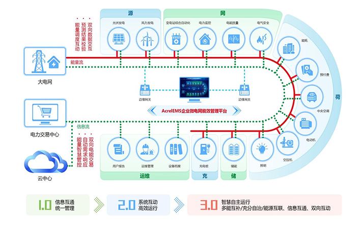 簡介:1.概述 通過在源、網、荷、儲、充的各個關鍵節(jié)點安裝監(jiān)測、分析、保護、治理裝置, 通過高性能邊緣計算網關采集數(shù)據(jù)并上傳至企業(yè)微網平臺。平臺根據(jù)新的電網價格、 用電負荷、電網調度指令等情況,調整各系統(tǒng)控制策略并遠程下發(fā),使企業(yè)微電網始終高效穩(wěn)定運行, 降低企業(yè)用電成本,實現(xiàn)能源互聯(lián)、信息互動。 2.應用場所 適用于各行業(yè)企業(yè)內部微電網管理系統(tǒng)的新建、擴建、改建等項目。 3.平臺結構 3.平臺功能 安科瑞AcrelEMS企業(yè)微電網能效管理平臺融合了電力監(jiān)控、電氣安全、照明控制、能源管控、充電樁運營管理、分布式光伏監(jiān)測、儲能管理、設備臺賬、運維管理等功能,通過一個平臺、一個APP整體的對企業(yè)用電進行集中監(jiān)控、統(tǒng)一調度、統(tǒng)一運維,并且根據(jù)當?shù)毓╇姴块T錯峰避峰計劃提前為企業(yè)制定錯峰避峰方案和預警,滿足企業(yè)